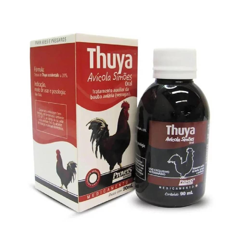 Detalhes do Produto A Thuya Avícola Simões é um produto indicado no tratamento de bouba (pipocas), verrugas e epitelioma contagioso das aves em geral (galinhas, perus, patos, pássaros de gaiola e viveiro) em todas as fases da criação, evitando as complicações que a doença produz.