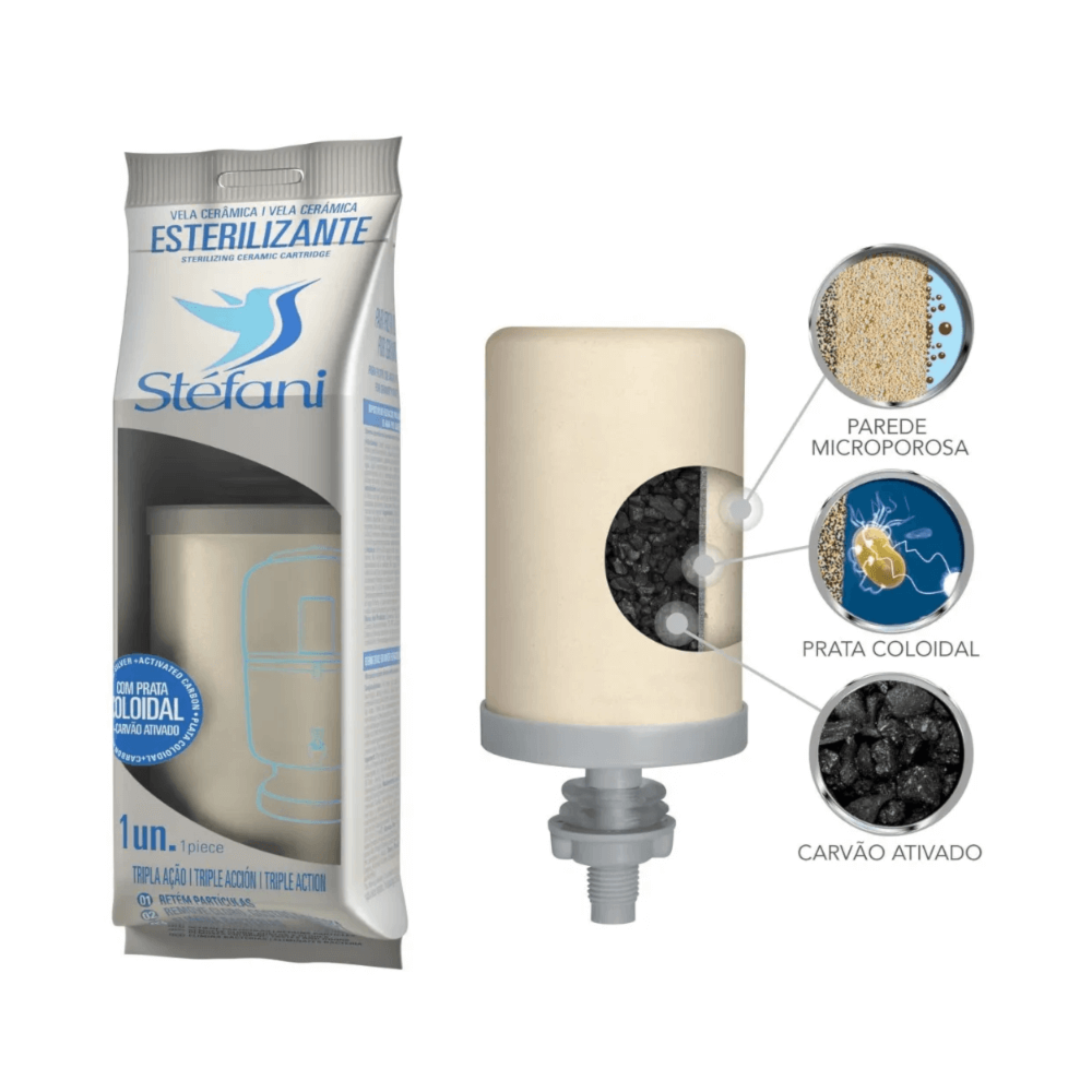 Tripla Ação - Esterilizante, com revestimento de prata coloidal aplicado na parte interna da vela, junto com o carvão ativado, trabalham para filtrar e reduzir odores, sabores e o teor de cloro, além de reduzir a presença de bactérias na água. A camada de prata aplicada internamente penetra pelos poros da vela, preservando sua propriedade esterilizante.