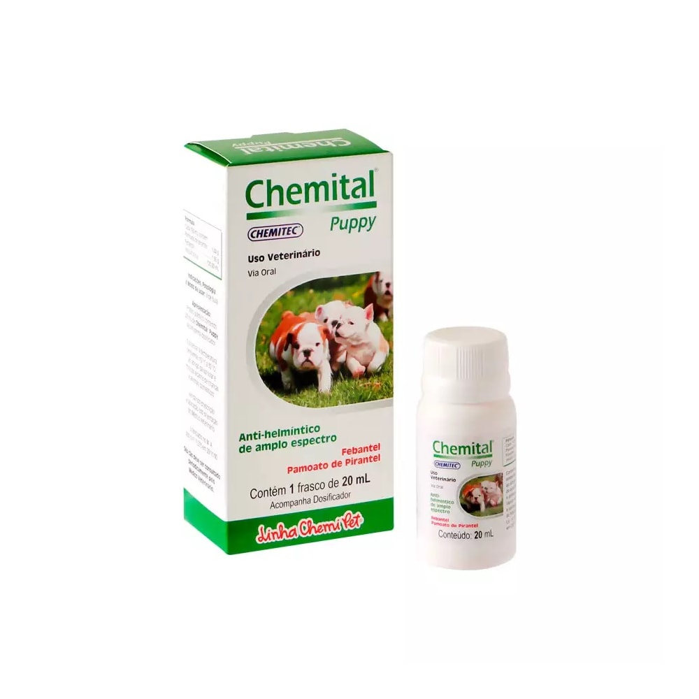 Detalhes do Produto O vermífugo Chemital® Puppy é um anti-helmíntico de amplo espectro para filhotes de cães e para cães adultos de raça miniatura. Chemital® Puppy combate com eficácia formas adultas e larvárias de ancilostomídeos, ascarídeos, cestódeos e tricurídeos que infestam os cães. Chemital® Puppy possui, além de excelente atuação graças ao sinergismo dos princípios ativos, uma margem de segurança ampla que permite sua administração enquanto o filhote mama e até para fêmeas prenhes de raça miniatura, em qualquer época da gestação. Chemital® Puppy combate: Ancylostoma brasiliense, Ancylostoma caninum, Uncinaria stenocephala, Toxocara canis, Toxascaris leonina, Trichuris vulpis.
