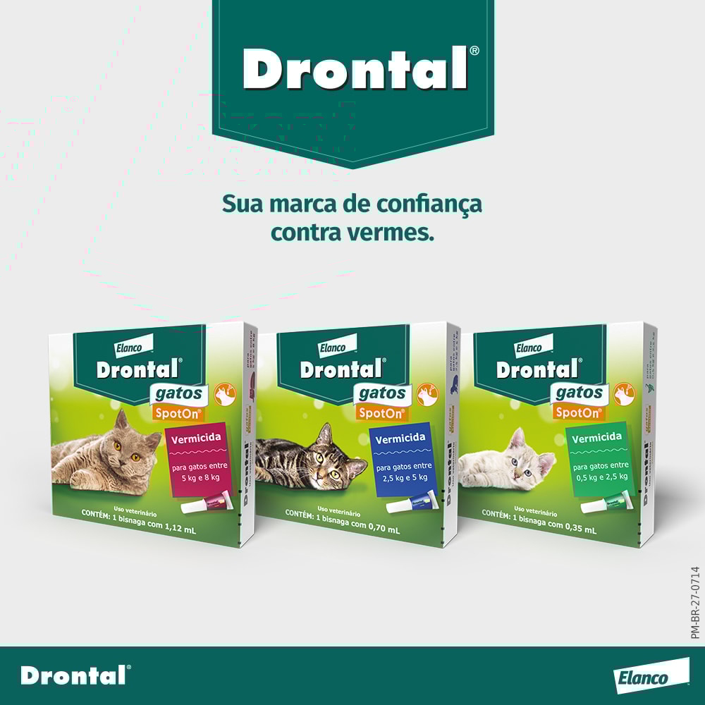 O Drontal SpotOn 0,65 ml (antigo Profender) Vermicida para Gatos Entre 0,5kg e 2,5kg da Bayer é especialmente indicado para o tratamento e controle das verminoses mistas, causadas pelas formas adultas e larvais dos parasitas intestinais dos gatos.
