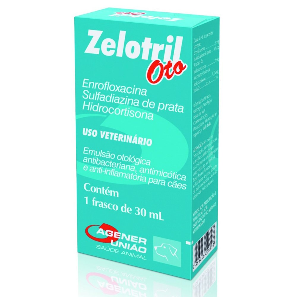 Antibiótico Otológico Zelotril Cães Agener Antimicrobiano eficaz à base de enrofloxacina para cães. Indicado para o tratamento de otites bacterianas e fungicas. Emulsão otológica antibacteriana, antimicótica e anti-inflamatória para cães, à base de enrofloxacina, sulfadiazina de prata e hidrocortisona. Absorção excelente e não é por via oral.